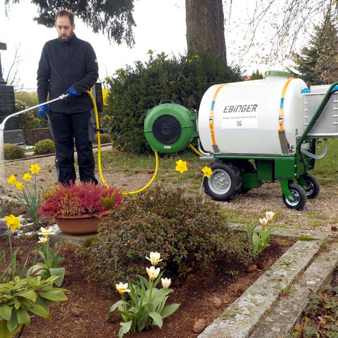 In combination with the BW 300 watering unit and the TBW battery pump, the Donkey Plus becomes a mobile watering vehicle for cemetery gardeners, in municipal areas or wherever quiet and emission-free watering is required.