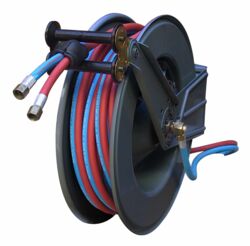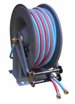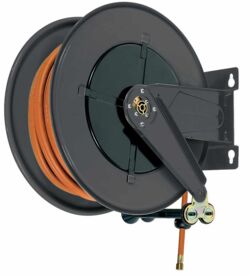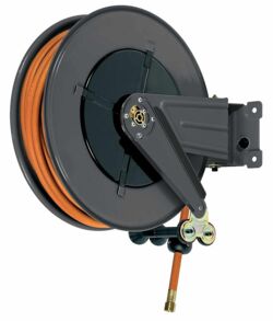 A manual hose reel is the simplest solution for storing hoses. An automatic hose reel offers significant advantages when handling the hose. After use, the hoses can be wound up quickly and easily. Hoses lying around and tripping hazards are a thing of the past. Effective working and the avoidance of accidents at work are just two of the advantages of an automatic hose reel. Thanks to an integrated locking mechanism, the hose can be locked and engaged with every rotation of the reel (approx. every 30-70 cm, depending on the model). The simplest type of automatic drive is a spring mechanism; for longer hose lengths or diameters, there are also models with an electric motor, hydraulic motor or pneumatic motor.