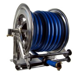 A manual hose reel is the simplest solution for storing hoses. An automatic hose reel offers significant advantages when handling the hose. After use, the hoses can be wound up quickly and easily. Hoses lying around and tripping hazards are a thing of the past. Effective working and the avoidance of accidents at work are just two of the advantages of an automatic hose reel. Thanks to an integrated locking mechanism, the hose can be locked and engaged with every rotation of the reel (approx. every 30-70 cm, depending on the model). The simplest type of automatic drive is a spring mechanism; for longer hose lengths or diameters, there are also models with an electric motor, hydraulic motor or pneumatic motor.