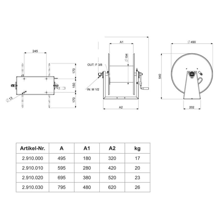 The MG manual hose reel is the ideal solution for professional applications in industry, trade and workshops where hose capacities of 50 - 200 m are required.