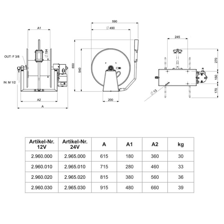 • the electric motor 12V DC, 43A, manually disengageable for motor freewheeling, allows the hose to be pulled out without motor resistance, even with long hose lengths