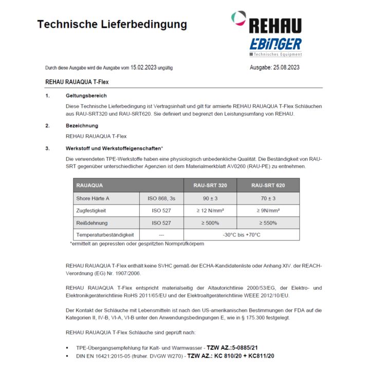 KTW-A means that the hose is suitable for constant contact with drinking water and meets the highest standards of hygiene and material purity.