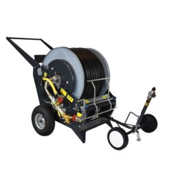 The irrigation trolley from Ebinger GmbH is designed for professional use. It has hose lengths from 31m to 200m and various hose diameters. The water throw range is designed for professional irrigation. The Ebinger GmbH irrigation trolley can be used in horticulture, agriculture, parks and sports facilities as well as riding arenas and halls, for example.