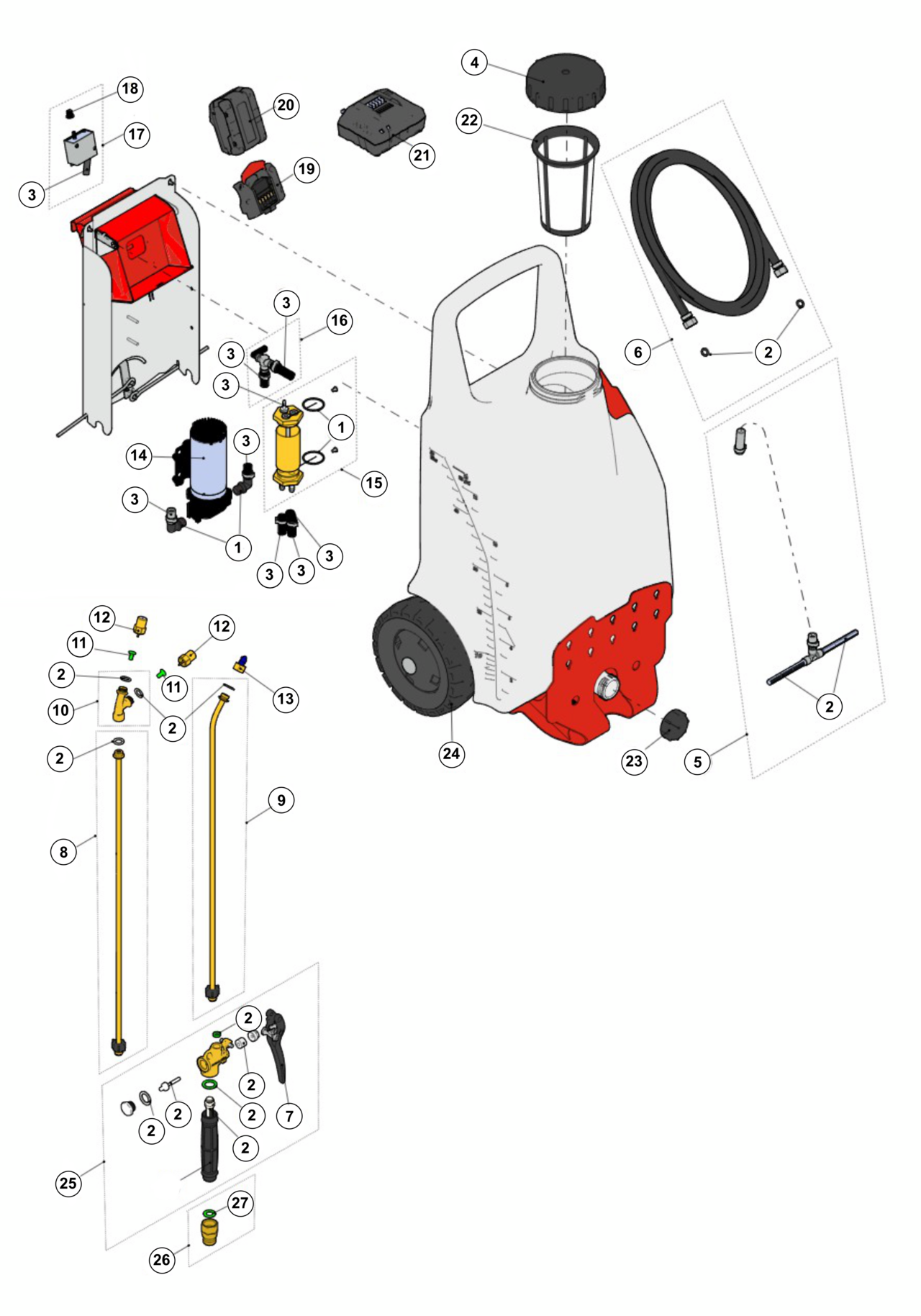 • Spraying time: up to 16 h or up to 1065 litres per battery pack charge (depending on pressure and accessories)