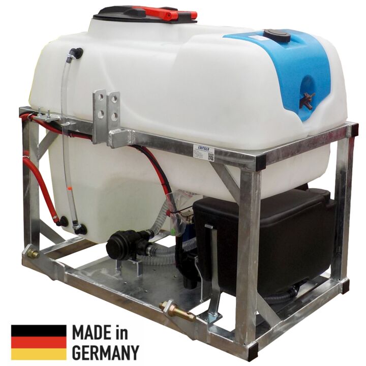 The sprayers are equipped with a flushing system for system cleaning as standard. By simply activating a 3-way tap, the flushing system can be switched over after application and the system can be cleaned. This saves a considerable amount of time during cleaning and residues of crop protection products in the system are optimally removed. A hand wash tank integrated in the tank provides fresh water for the user in the event of contamination.