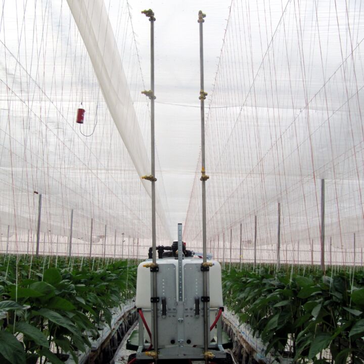 The device represents a significant further development of existing plant protection devices. It is an absolute novelty in this design and equipment. When using conventional cart sprayers with a hose line and spray gun, uniform application is difficult to achieve.